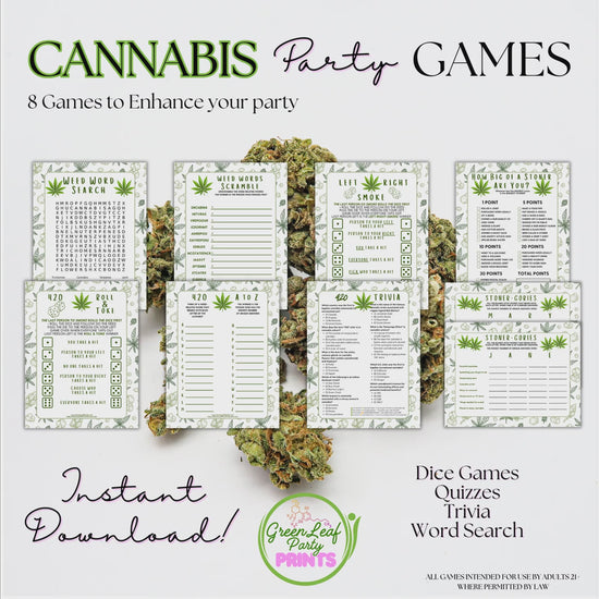 Enhance your party with this set of 8 cannabis-themed games! This digital download includes entertaining dice games, quizzes, trivia, and word games. Perfect for adult parties, these games promise to bring joy and laughter to your event.